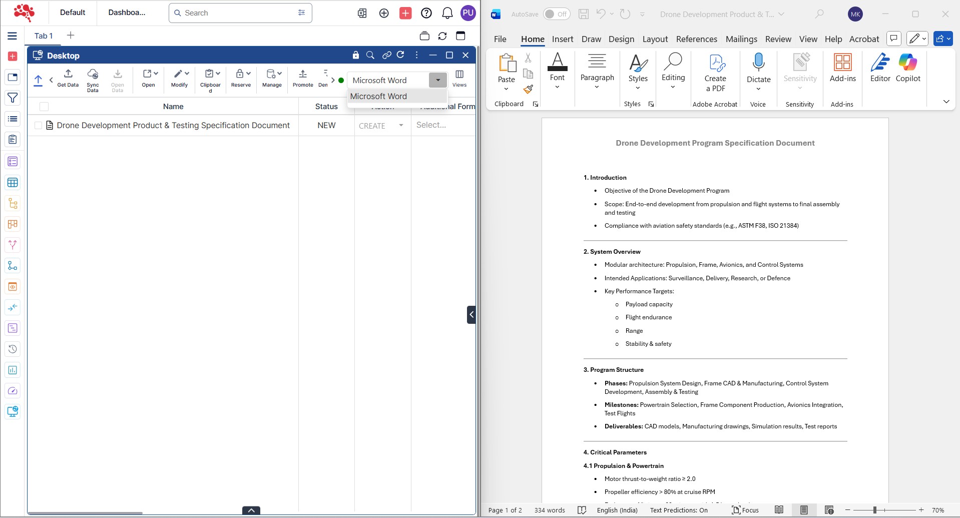 - To upload a document from any Microsoft Office application to Nora IPLM, launch the Desktop Services App on your Windows PC and open the Microsoft Office file you want to upload. Then go to the Nora IPLM platform and open the Desktop widget. In this example, we will use a Word document.