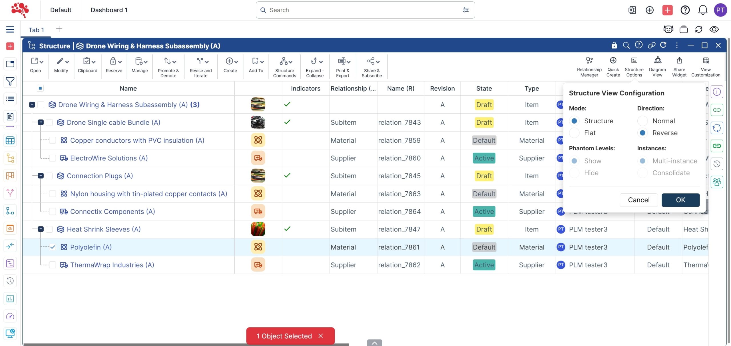 1. In “Structure Options”, select the “Reverse” direction to view the where-used and click on “OK”.
