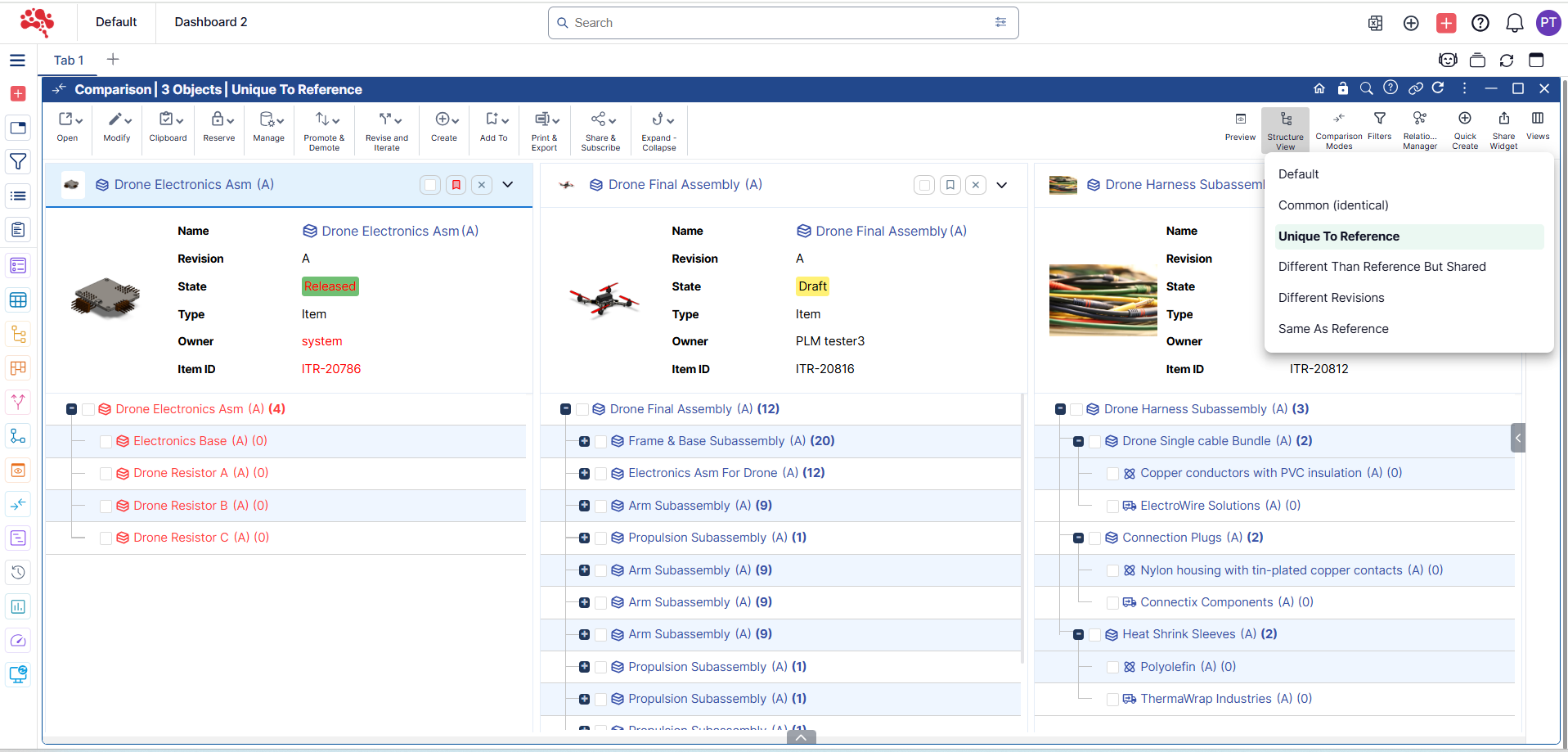 Compare multiple objects, revisions, or baselines simultaneously in a single view. Gain a complete, side-by-side view that helps you analyze design changes, structural variations, and attribute differences with ease.