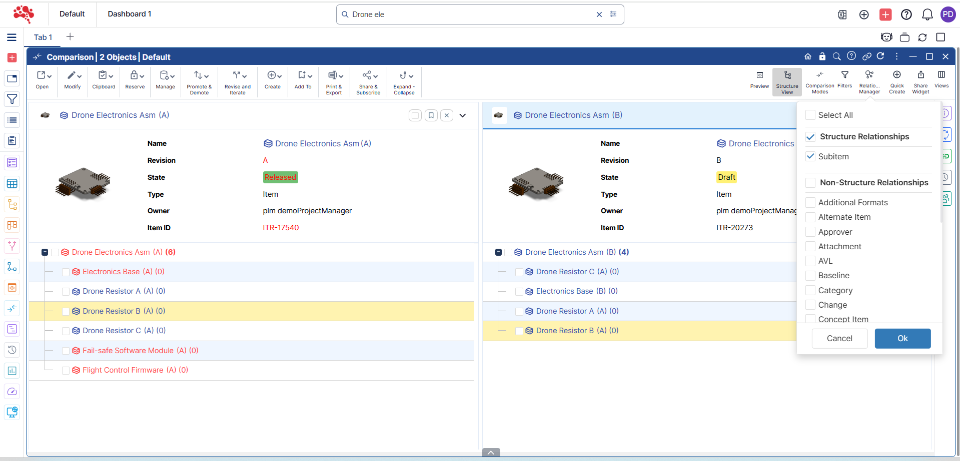 Compare objects, BOMs, projects and baselines side by side for faster, informed, and streamlined PLM decisions.