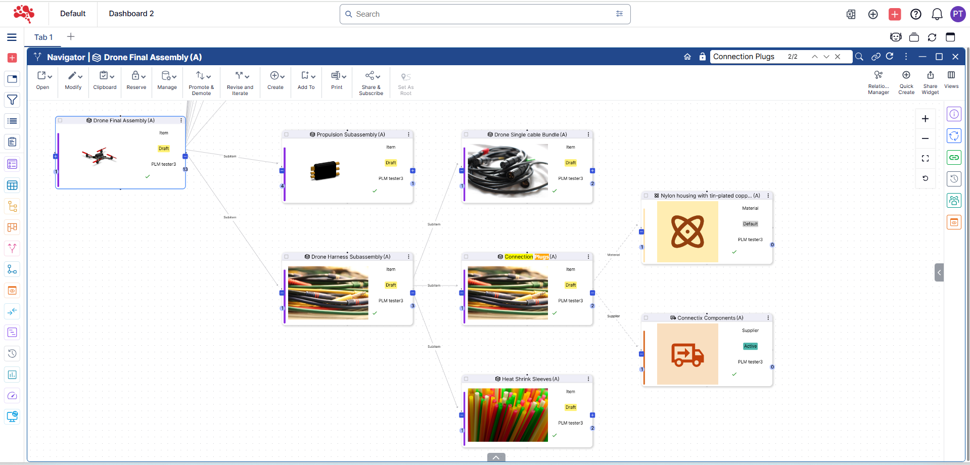 The Navigator Widget visualizes all relationships within the PLM ecosystem, allowing users to explore connected data and move between items with a single click.