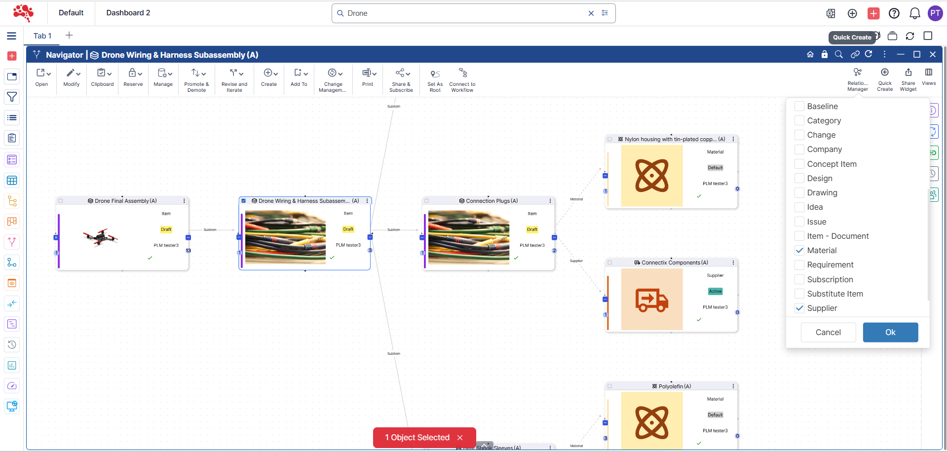Nora IPLM’s Navigator Widget lets you explore product data through a visual relationship map. Key commands include expanding object links, drilling into connected parts or documents, and jumping across CAD, BOM, and change records – all in just a click.