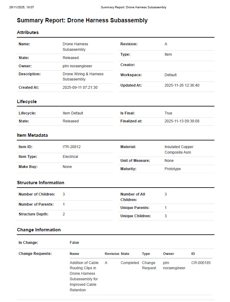 Nora IPLM Summary Reports turn complex PLM data into clear, actionable views for every product, project and change. Key details, relationships and status are pulled into one place, so teams can review faster, decide with confidence and export what they need in seconds.