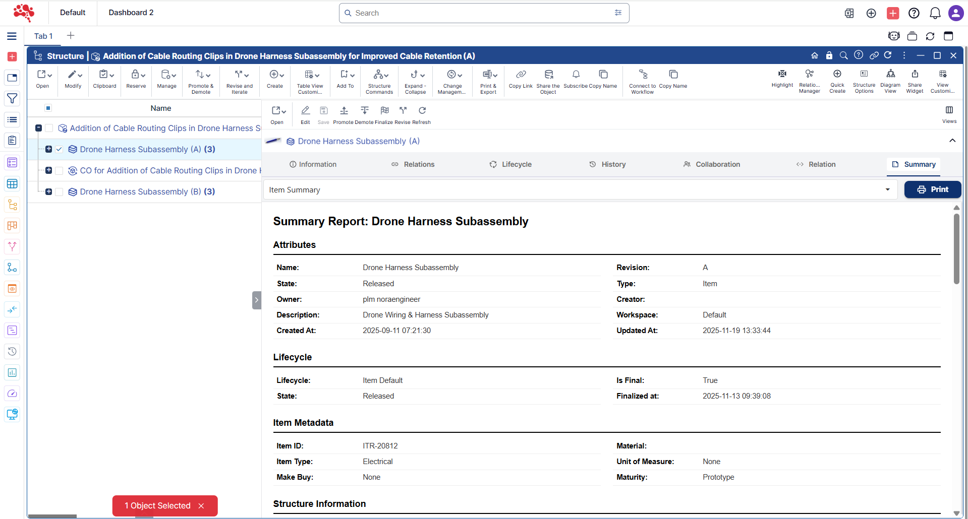 See object attributes, structures, histories, dependencies, and BOM details at a glance. Everything is organized and accurate, giving you the context you need without searching across modules.