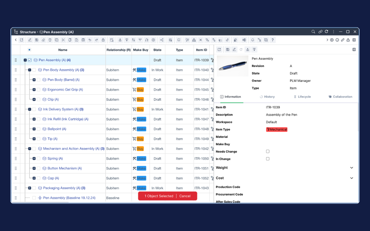 Nora IPLM streamlines BOM creation, linking, and organization through intuitive widgets and commands. Define attributes in detail, handle multi-level hierarchies, and keep data accurate with tools like mass updates and expand/collapse commands. Complex structures stay organized and always up to date.