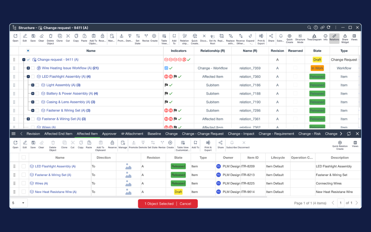 Nora IPLM automates the management of affected items using categories like Revise, Release, Make Obsolete, and Modify. This streamlines the change process and minimizes errors in the engineering change management system.