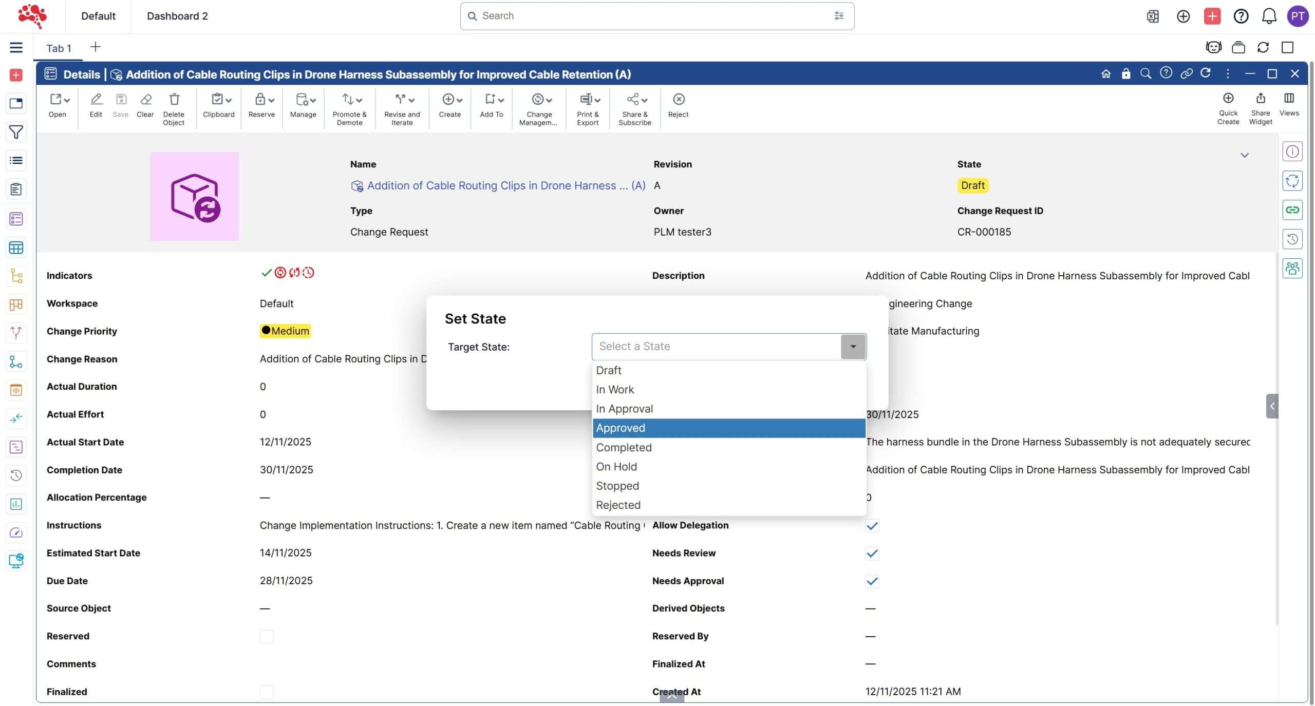 2. Select Approved from the dropdown to set the Change Request to the approved state.