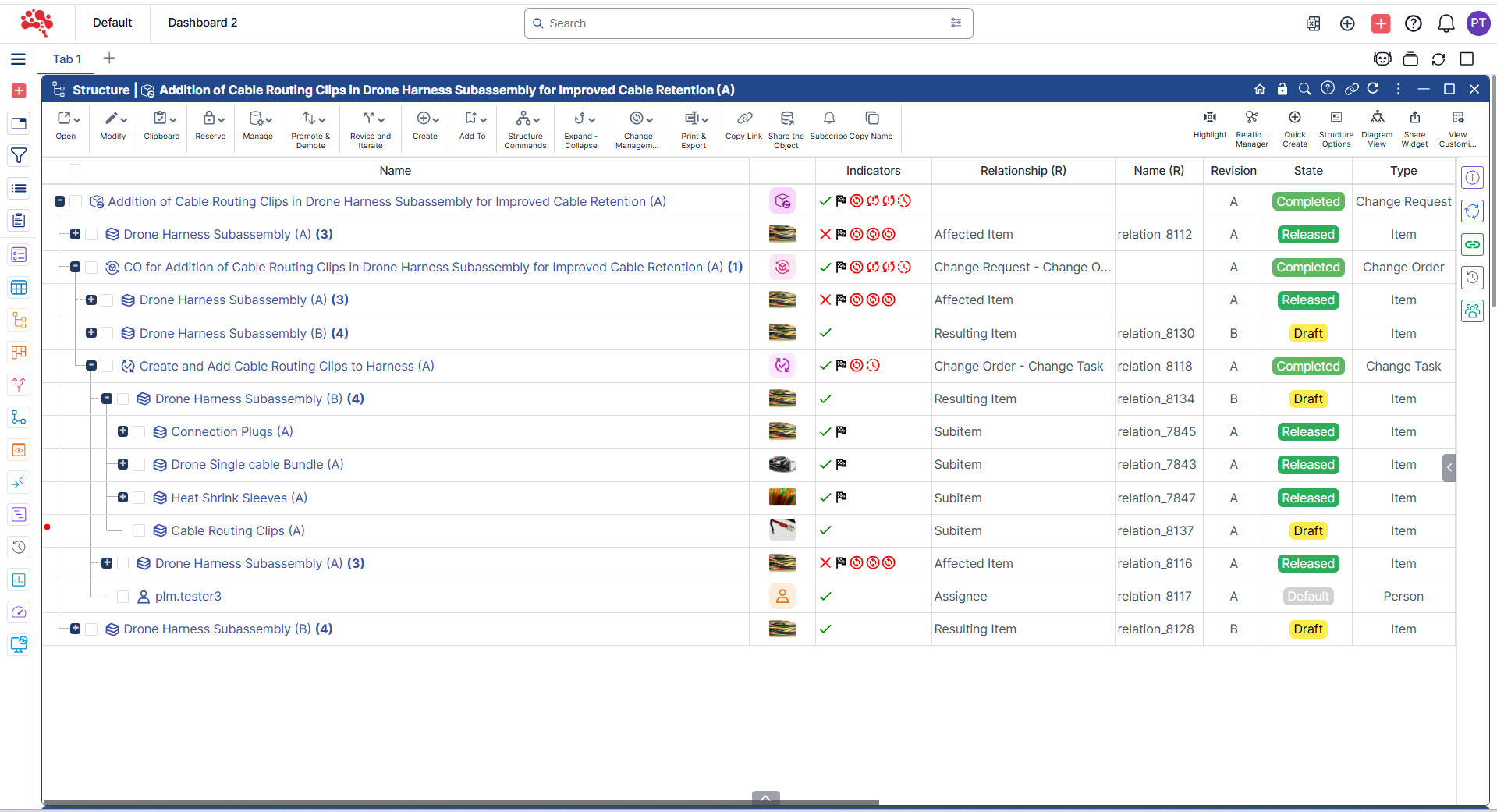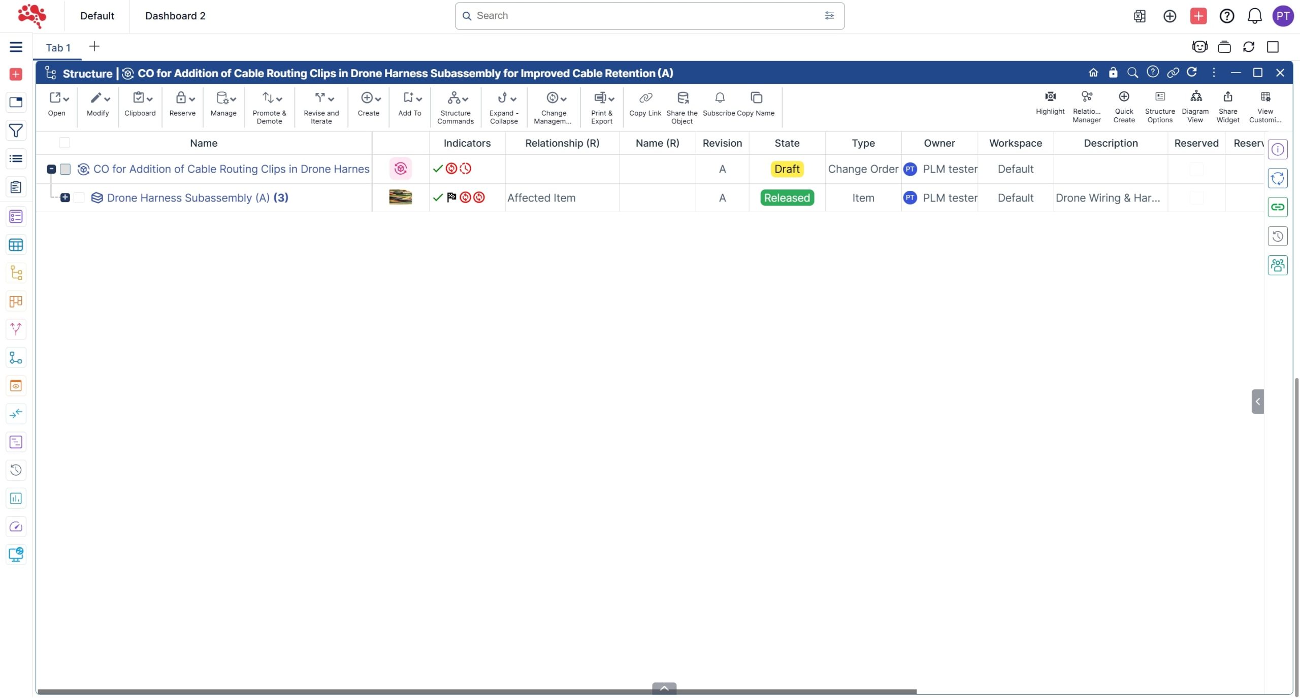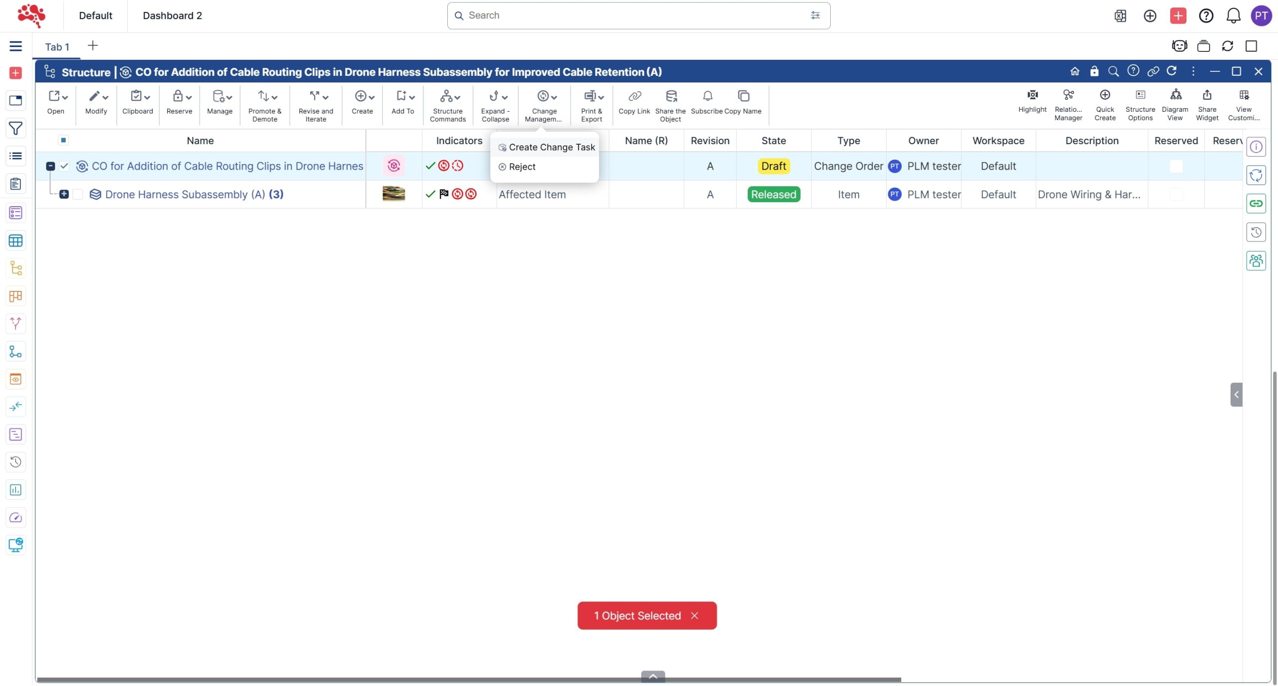 7. The new Change Order is displayed along with the corresponding affected item in the Structure widget.