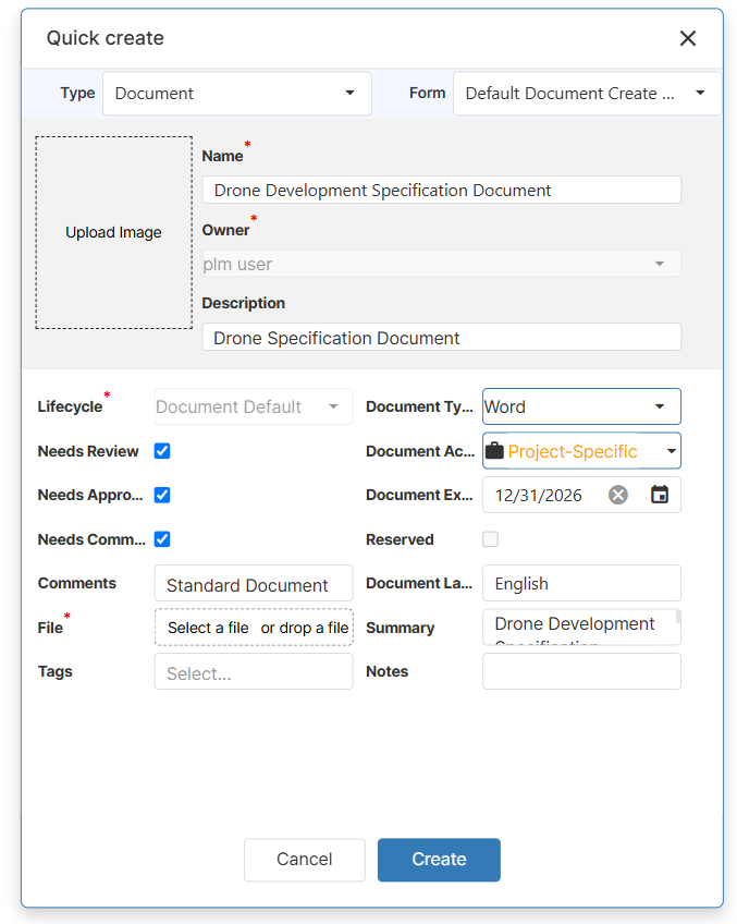 2. In the Quick Create pop-up, select Type as Document and enter the document name and relevant details.