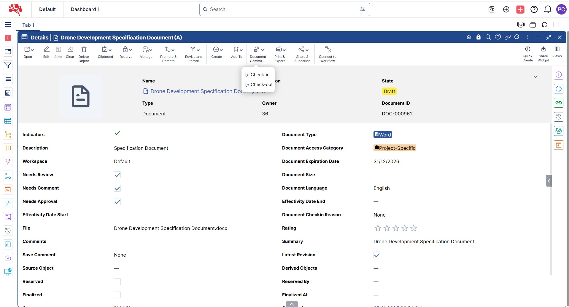 1. Open the document that needs modification in any widget and select “Check-Out” from the Document commands.