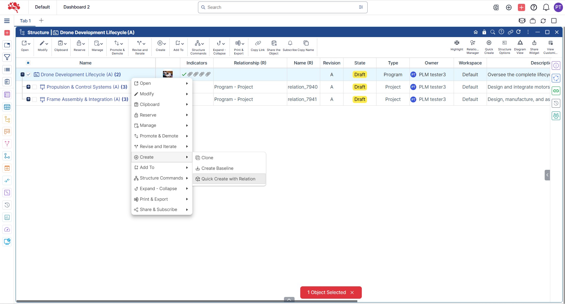 - Open the Program, Project, or Item to which you want to associate a document. In this Example: Open a Program, right-click, and select “Quick Create with Relations”.